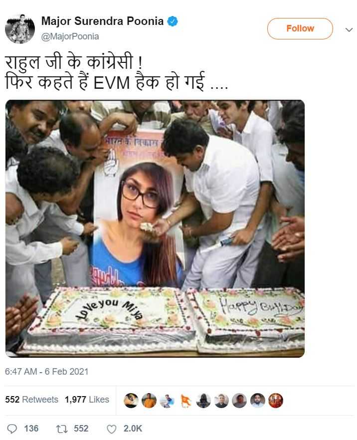 वायरल तस्वीर जिसमें कांग्रेस (Congress) वर्कर्स एक बैनर पर फॉर्मर पोर्नस्टार मिया ख़लीफ़ा (Mia Khalifa) की तस्वीर को केक खिलाते नज़र आते हैं, फ़र्ज़ी है. इसे फ़ोटोशॉप किया गया है.
