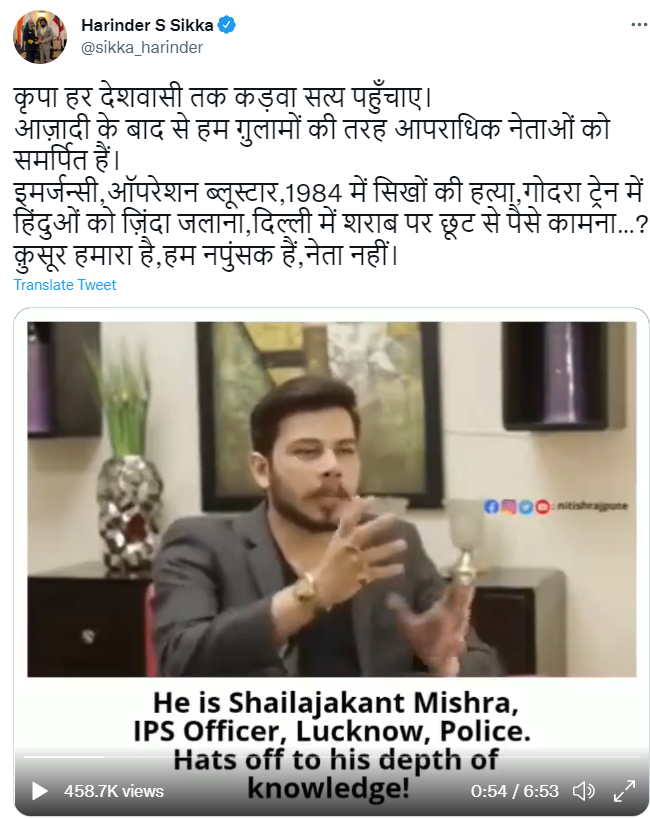 भारतीय नौसेना में अपनी सेवाएं दे चुके और लेखक हरिंदर एस सिक्का ने भी इस वीडियो को अपने वेरिफ़ाईड ट्विटर अकाउंट से साझा किया है और लिखा है, "कृपा हर देशवासी तक कड़वा सत्य पहुँचाए।आज़ादी के बाद से हम ग़ुलामों की तरह आपराधिक नेताओं को समर्पित हैं। इमर्जन्सी,ऑपरेशन ब्लूस्टार,1984 में सिखों की हत्या,गोदरा ट्रेन में हिंदुओं को ज़िंदा जलाना,दिल्ली में शराब पर छूट से पैसे कामना…? क़ुसूर हमारा है,हम नपुंसक हैं,नेता नहीं।"