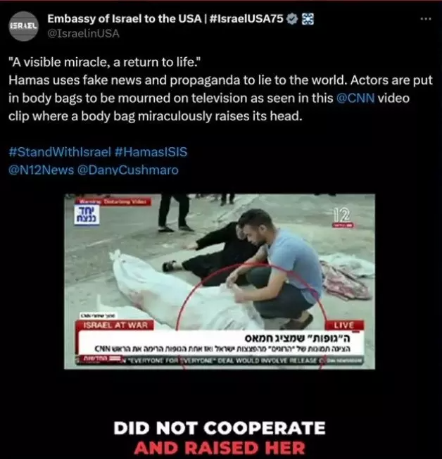 अमेरिका में इसराइली दूतावास के अधिकारिक X (पूर्व में ट्विटर) अंकाउट ने 30 अक्टूबर, 2023 को वीडियो को शेयर करते हुए लिखा, "एक दिखाई देने वाला चमत्कार, जीवन की वापसी." 'हमास दुनिया को झूठ बोलने के लिए फ़र्ज़ी ख़बर और प्रचार का इस्तेमाल करता है. टेलीविजन पर शोक मनाने के लिए जीवित लोगों को बॉडी बैग में रखा जाता है. CNN की इस वीडियो क्लिप में देखा जा सकता है कि कैसे एक शव बैग में से चमत्कारिक ढंग से अपना सिर उठा रहा है."