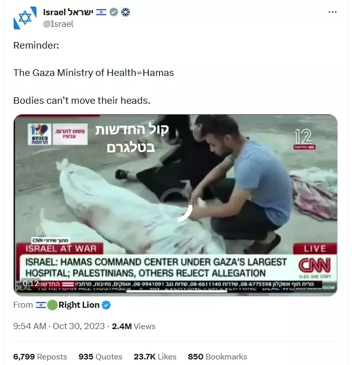 इसी वीडियो को इसराइल के एक आधिकारिक X (पूर्व में ट्विटर) ने शेयर करते हुए लिखा, "रिमाइंडर: गाजा स्वास्थ्य मंत्रालय = हमास. शव अपना सिर नहीं हिला सकते."