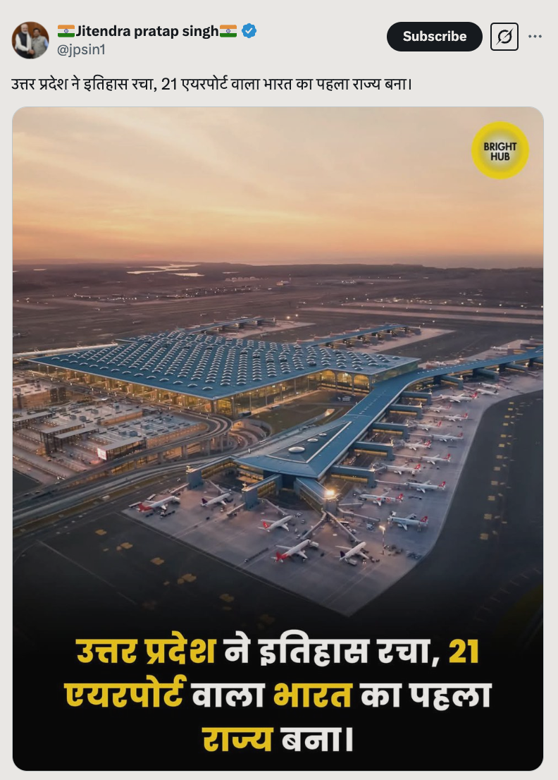 एक्स पर यूजर ने इस तस्वीर को शेयर करते हुए लिखा, ‘उत्तर प्रदेश ने इतिहास रचा, 21 एयरपोर्ट वाला भारत का पहला राज्य बना.’