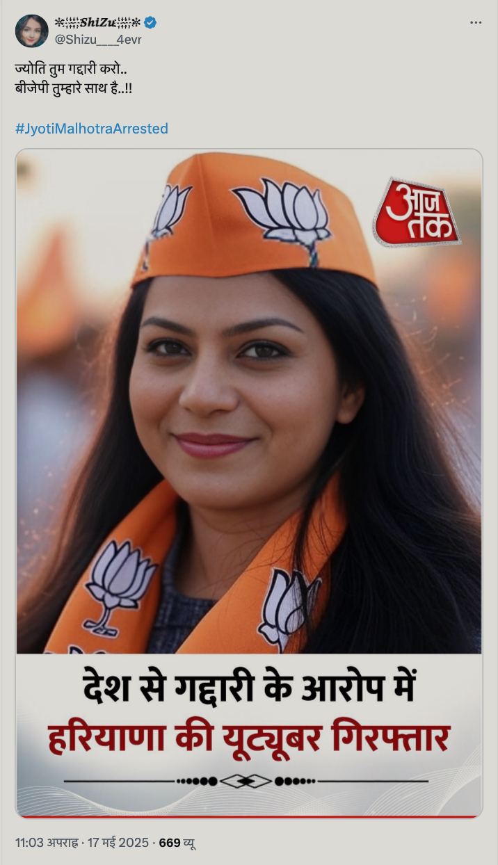 न्यूज आउटलेट ने यूट्यूबर और इन्फ्लुएंसर ज्योति मल्होत्रा की गिरफ्तारी और पाकिस्तान के लिए जासूसी करने के आरोप की रिपोर्ट करते हुए सोशल मीडिया पर कई पोस्ट किए, हालांकि उनमें से कोई भी पोस्ट वायरल ग्राफिक से मेल नहीं खाता है.
