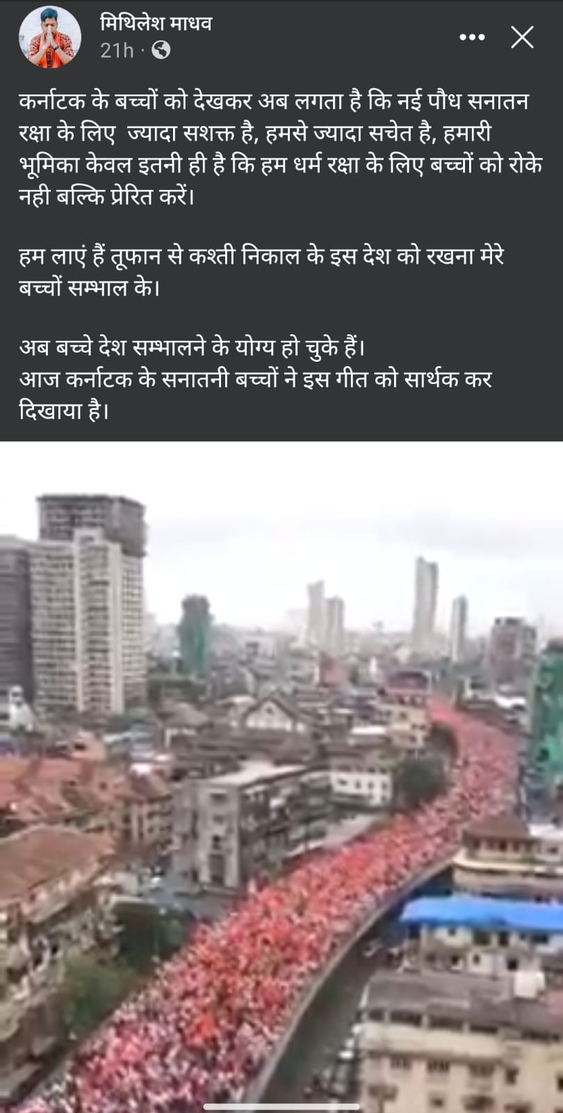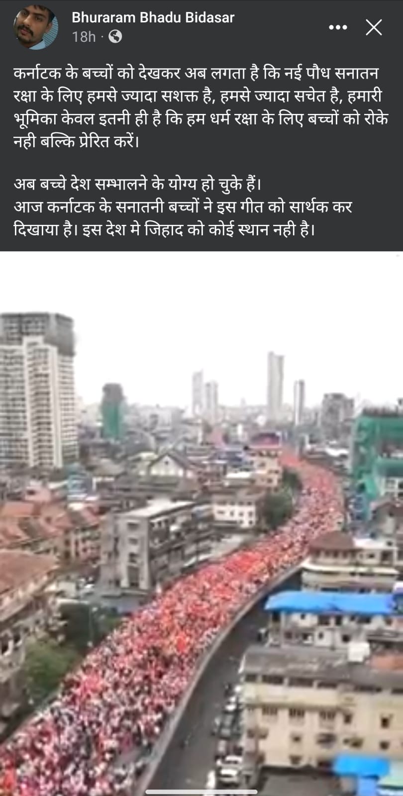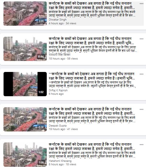 फ़ेसबुक पर वीडियो शेयर करते हुए एक यूज़र ने कैप्शन लिखा, "कर्नाटक के बच्चों को देखकर अब लगता है कि नई पौध सनातन रक्षा के लिए हमसे ज्यादा सशक्त है, हमसे ज्यादा सचेत है, हमारी भूमिका केवल इतनी ही है कि हम धर्म रक्षा के लिए बच्चों को रोके नही बल्कि प्रेरित करें। अब बच्चे देश सम्भालने के योग्य हो चुके हैं। आज कर्नाटक के सनातनी बच्चों ने इस गीत को सार्थक कर दिखाया है। इस देश मे जिहाद को कोई स्थान नही है."
