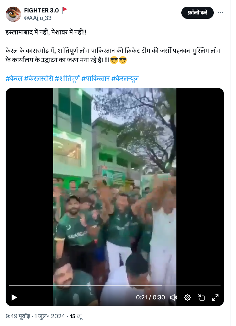 एक एक्स यूजर ने वीडियो शेयर करते हुए लिखा, 'इस्लामाबाद में नहीं, पेशावर में नहीं. केरल के कासरगोड में, शांतिपूर्ण लोग पाकिस्तान की क्रिकेट टीम की जर्सी पहनकर मुस्लिम लीग के कार्यालय के उद्घाटन का जश्न मना रहे हैं.'