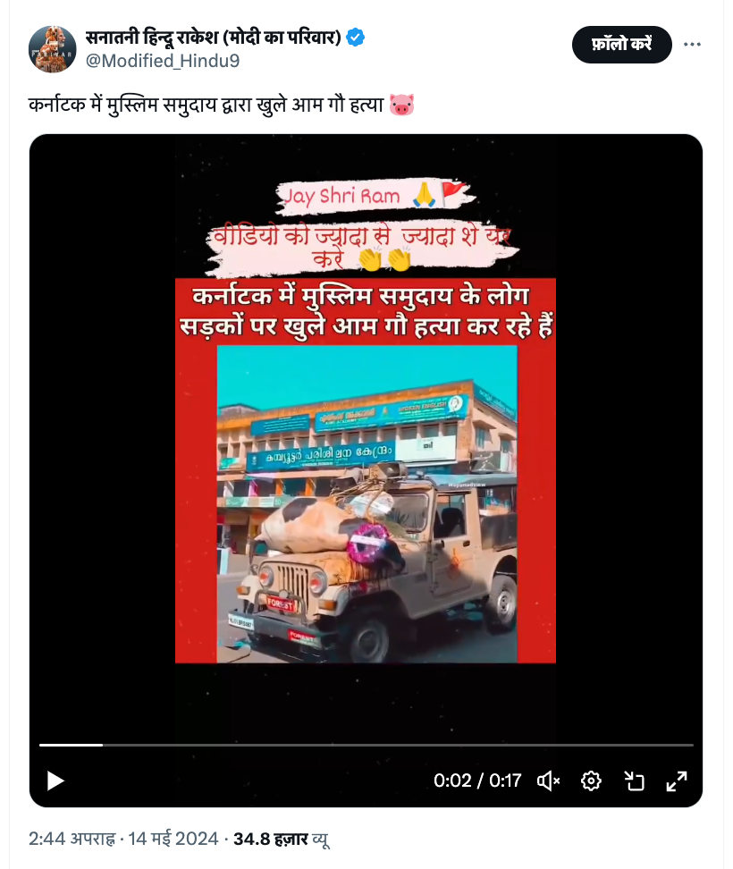 सोशल मीडिया प्लेटफॉर्म एक्स पर एक यूजर ने वीडियो शेयर करते हुए लिखा, 'कर्नाटक में मुस्लिम समुदाय द्वारा खुले आम गौ हत्या.'