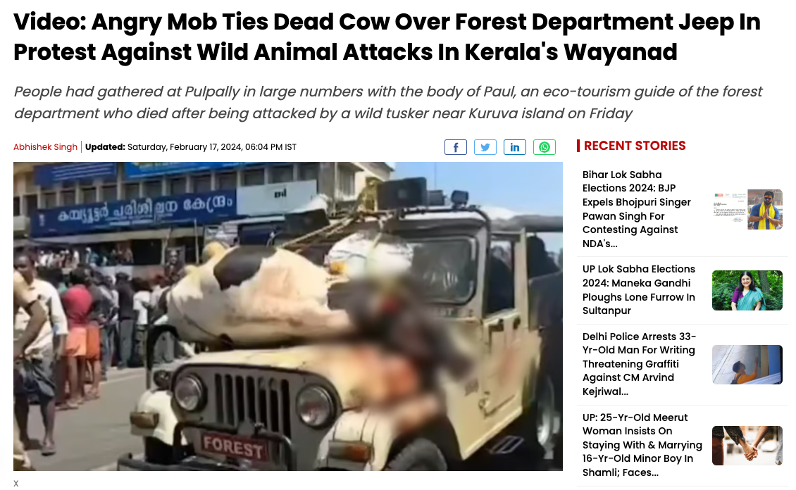 इंडियन एक्सप्रेस ने 18 फरवरी 2024 की अपनी रिपोर्ट में वायरल वीडियो के एक फ्रेम के साथ लिखा कि केरल के वायनाड में हाथी के हमले के कारण एक इको-टूरिज्म गाइड की मौत के बाद लोगों ने सड़क को जाम कर दिया.