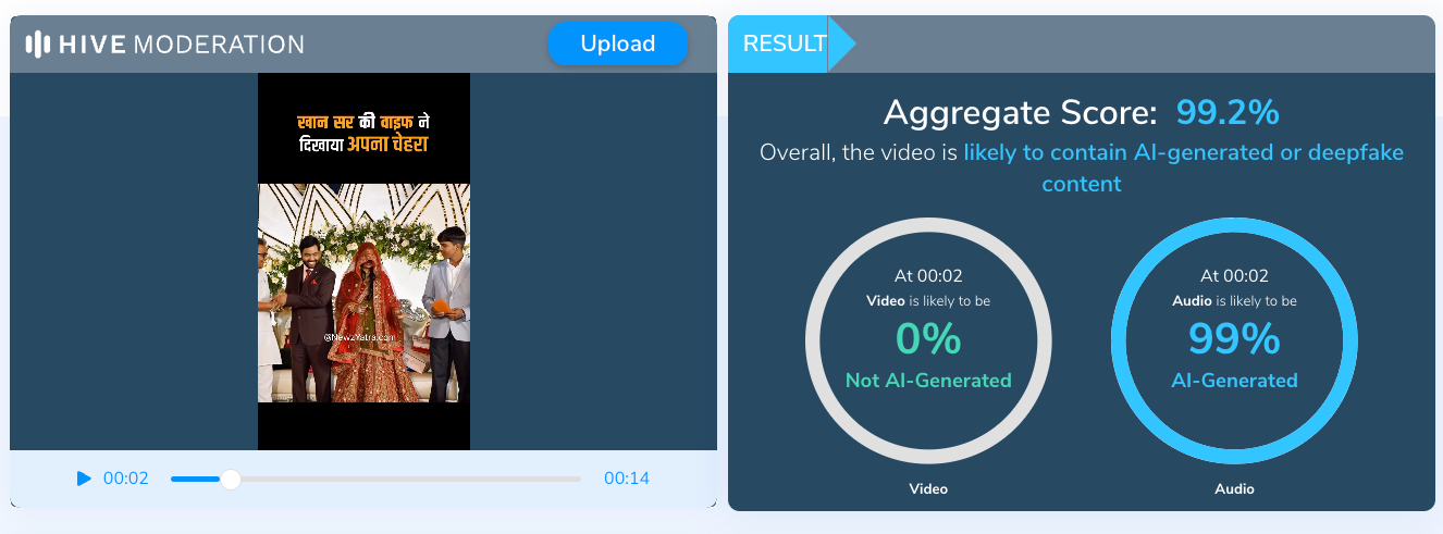 हमने वायरल वीडियो को एआई डिटेक्टर टूल हाइव पर चेक किया. इसके मुताबिक वायरल वीडियो के एआई जनरेटेड होने की संंभावना 99 प्रतिशत से अधिक है.