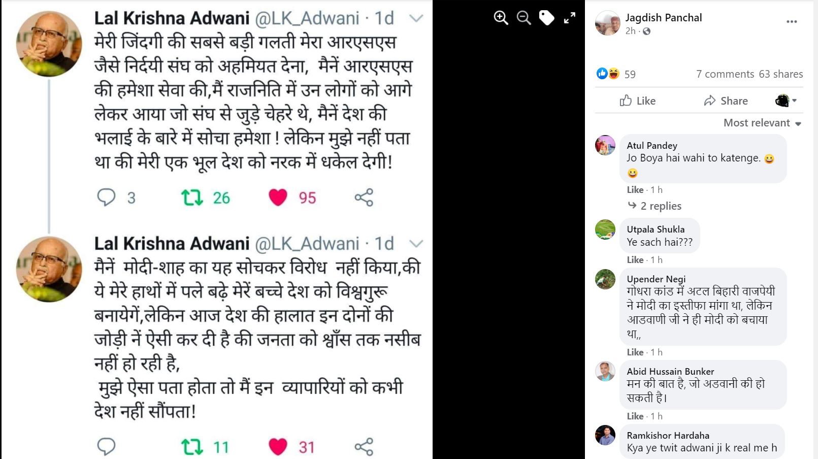 इसके साथ एक अन्य ट्वीट में लिखा है: "मैनें मोदी-शाह का यह सोचकर विरोध नहीं किया, की ये मेरे हाथों में पले बढ़े मेरे बच्चे देश को विश्वगुरू बनायेगें, लेकिन आज देश की हालात इन दोनों की जोड़ी ने ऐसी कर दी है की जनता को श्वाँस तक नसीब नहीं हो रही है, मुझे ऐसा पता होता तो मैं इन व्यापारियों को कभी देश नहीं सौंपता!"