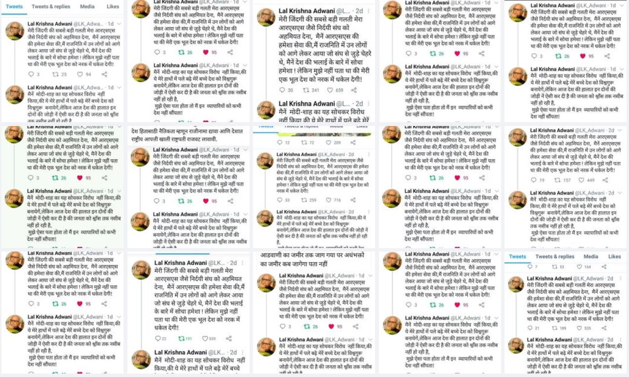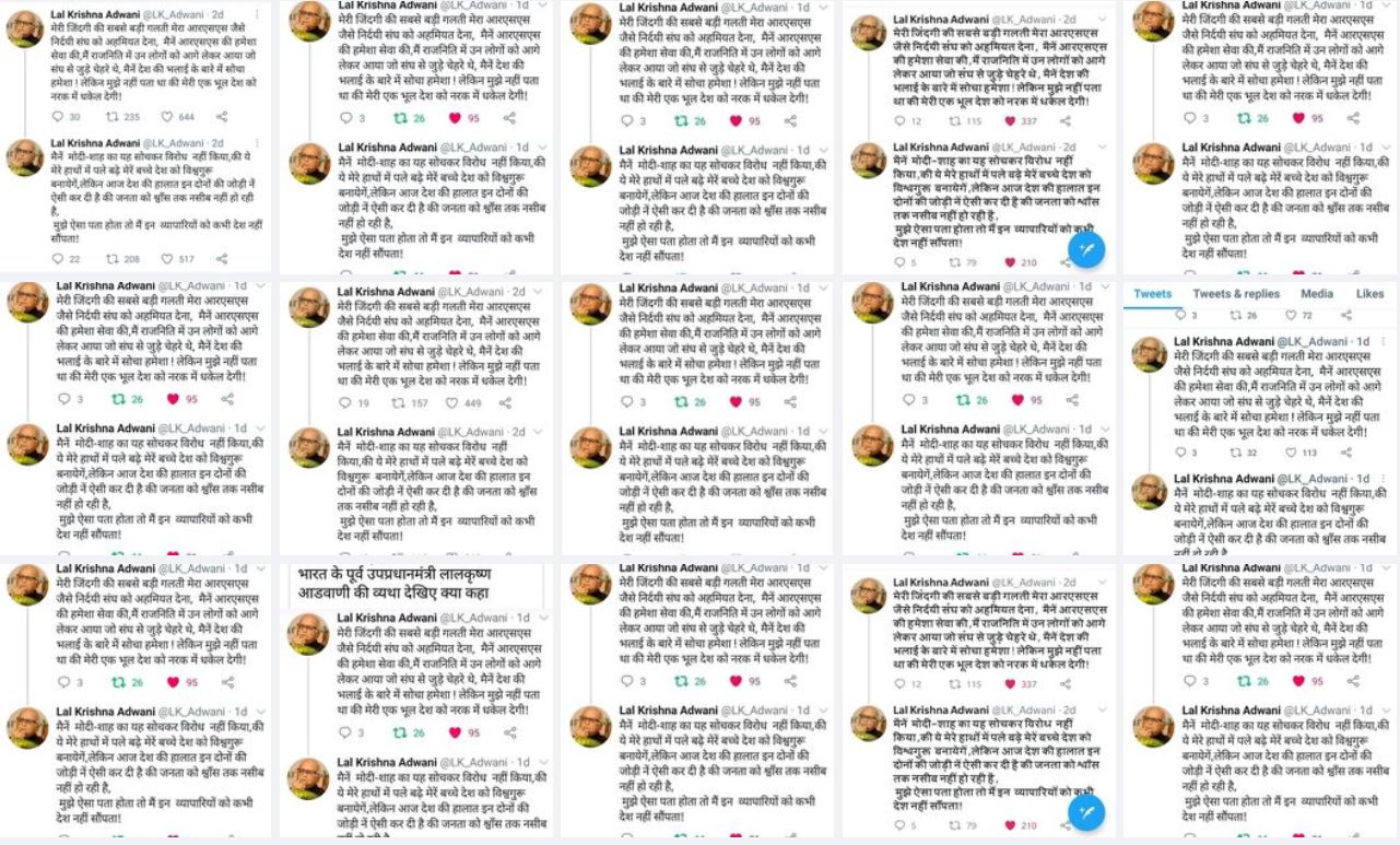 इसके अलावा पूरी टाइमलाइन में नरेंद्र मोदी, अमित शाह और भाजपा के विरोध में कई ट्वीट्स हैं. और तो और कुछ ट्वीट्स ऐसे भी हैं जिसमें लाल कृष्ण आडवाणी का मखौल बनाया गया है. इससे पुष्टि होती है कि हैंडल एल.के आडवाणी का नहीं है.