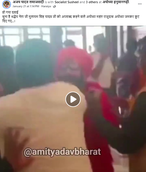 फेसबुक पर इस वीडियो को शेयर करते हुए एक सपा समर्थक ने दावा किया कि 'श्रद्धेय नेता जी मुलायम सिंह यादव जी को अपशब्द कहने वाले महंत राजूदास अयोध्या जमकर कूट दिए गए.'