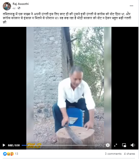 फ़ेसबुक पर एक यूज़र ने वीडियो पोस्ट करते हुए लिखा, "तमिलनाडु में एक शख्स ने अपनी उंगली इस लिए काट दी की उसने इसी उंगली से कांग्रेस को वोट दिया था, और कांग्रेस सरकार से इंसाफ न मिलने से परेशान था। वह कह रहा है मोदी सरकार को वोट न देकर बहुत बड़ी गलती की."