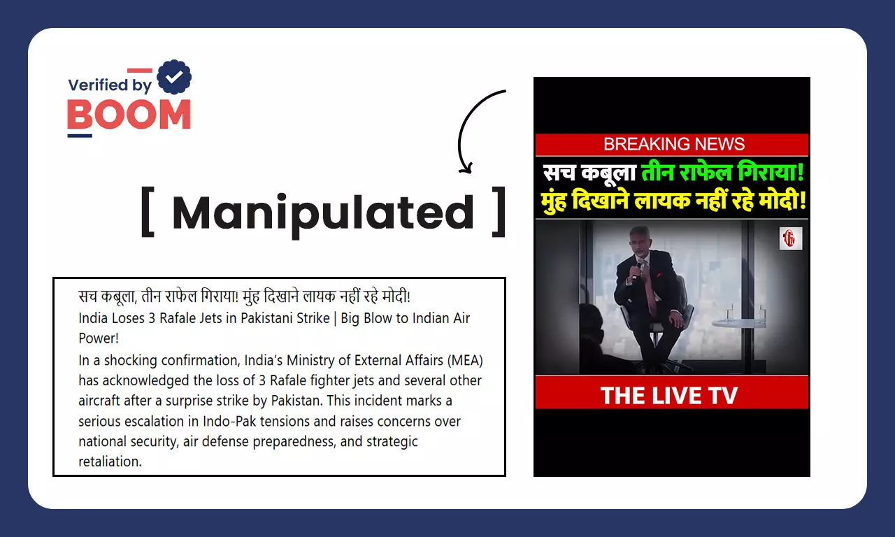 वीडियो में जयशंकर के हवाले से एक झूठा बयान जोड़ा गया है, जिसमें वह जिसमें वह कथित रूप से कह रहे हैं, “उस रात पाकिस्तान ने बड़ा हमला किया, हमने अपने 3 राफेल विमानों को खो दिया, उनका हमला बहुत गलत था लेकिन उन्होंने फिर भी ऐसा किया...”