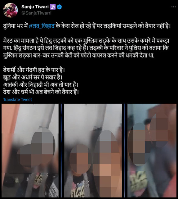 वेरीफाईड ट्विटर हैंडल संजू तिवारी ने वीडियो के साथ कैप्शन दिया, “दुनिया भर में #लव_जिहाद के केस रोज हो रहे हैं पर लड़कियां समझने को तैयार नहीं है। मेरठ का मामला है ये हिंदू लड़की को एक मुस्लिम लड़के के साथ उसके कमरे में पकड़ा गया. हिंदू संगठन इसे लव जिहाद कह रहे हैं। लड़की के परिवार ने पुलिस को बताया कि मुस्लिम लड़का बार-बार उनकी बेटी को फोटो वायरल करने की धमकी देता था.”