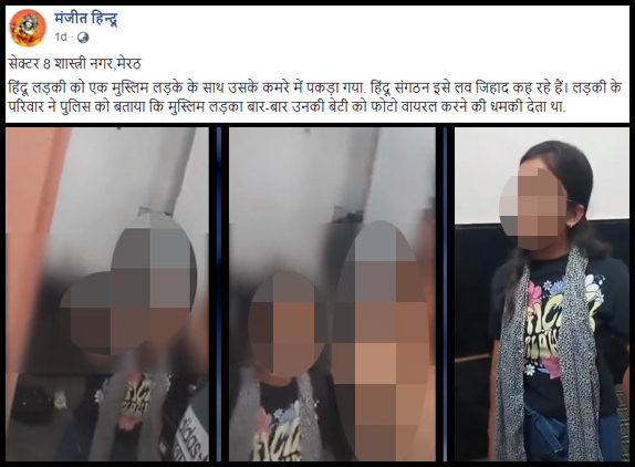 उत्तर प्रदेश के मेरठ में “लव जिहाद” के दावे के साथ एक वीडियो सोशल मीडिया पर वायरल हो रहा है. इस वीडियो को शेयर करते हुए दावा किया जा रहा है कि हिन्दू लड़की को मुस्लिम लड़के के साथ उसके कमरे में पकड़ा गया. वायरल दावे में यह भी कहा गया है कि लड़की के पिता ने पुलिस को बताया कि मुस्लिम लड़का उनकी बेटी को तस्वीर वायरल करने की धमकी देता था.