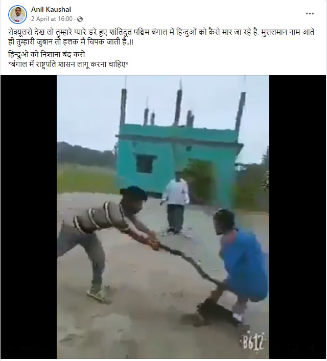 फ़ेसबुक पर वीडियो को इस कैप्शन के साथ शेयर किया गया है, जिसमें लिखा हुआ है “सेक्यूलरो देख लो तुम्हारे प्यारे डरे हुए शांतिदूत पश्चिम बंगाल में हिन्दुओं को कैसे मार जा रहे है, मुसलमान नाम आते ही तुम्हारी जुबान तो हलक मै चिपक जाती है..!!हिन्दुओ को निशाना बंद करो बंगाल में राष्ट्रपति शासन लागू करना चाहिए”.