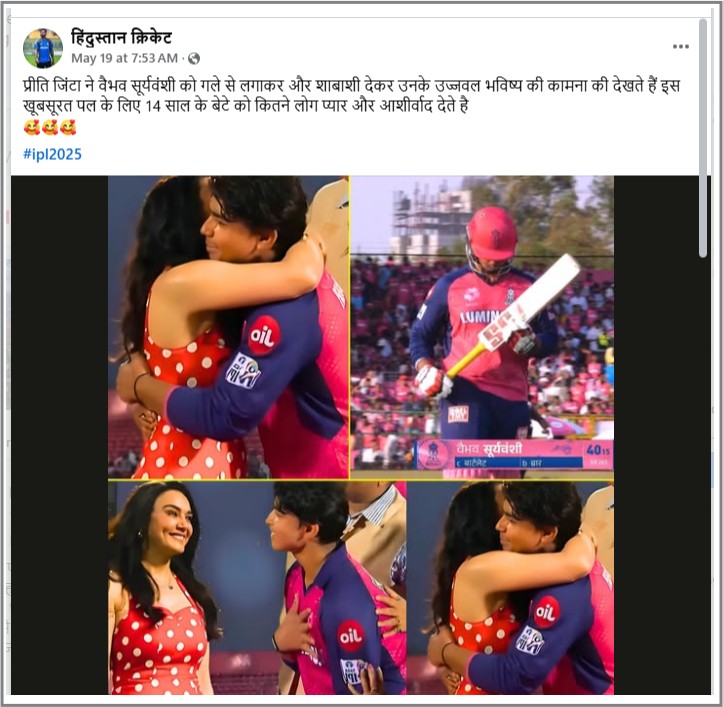 फेसबुक पर एक यूजर ने तस्वीर को शेयर करते हुए लिखा, 'प्रीति जिंटा ने वैभव सूर्यवंशी को गले से लगाकर और शाबाशी देकर उनके उज्जवल भविष्य की कामना की.'