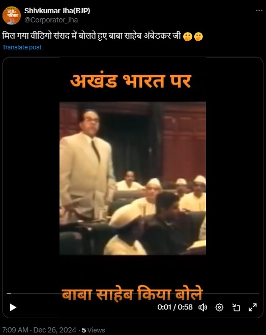 एक्स पर बीजेपी से जुड़े शिवकुमार झा ने इस वीडियो को शेयर करते हुए लिखा, 'मिल गया वीडियो, संसद में बोलते हुए बाबा साहेब आंबेडकर जी.'