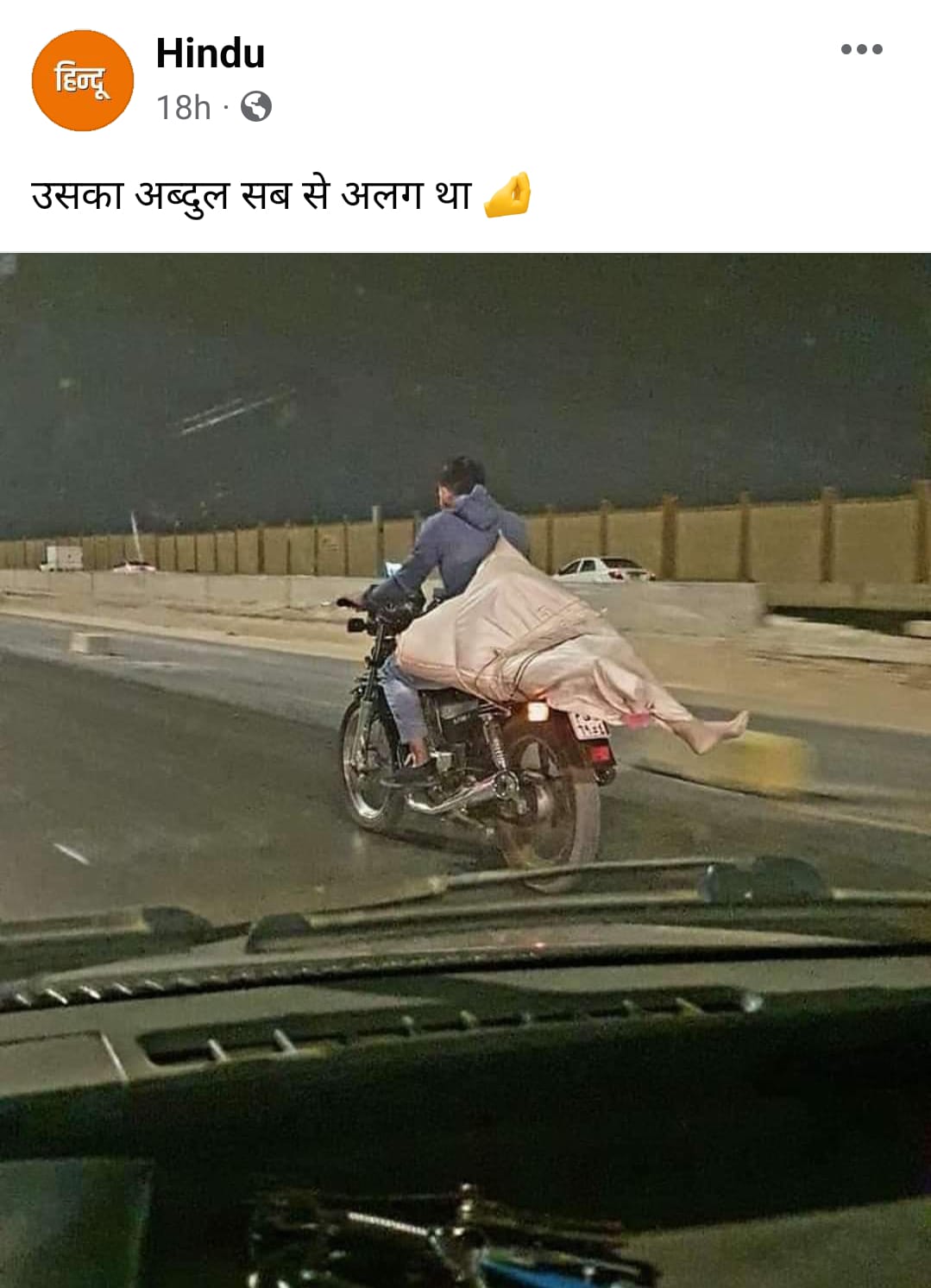 दक्षिणपंथी सोशल मीडिया यूज़र्स एक तस्वीर को इस दावे के साथ शेयर कर रहे हैं कि इस तस्वीर में एक मुस्लिम व्यक्ति को बाइक पर एक लाश ले जाते हुए दिखाया गया है.