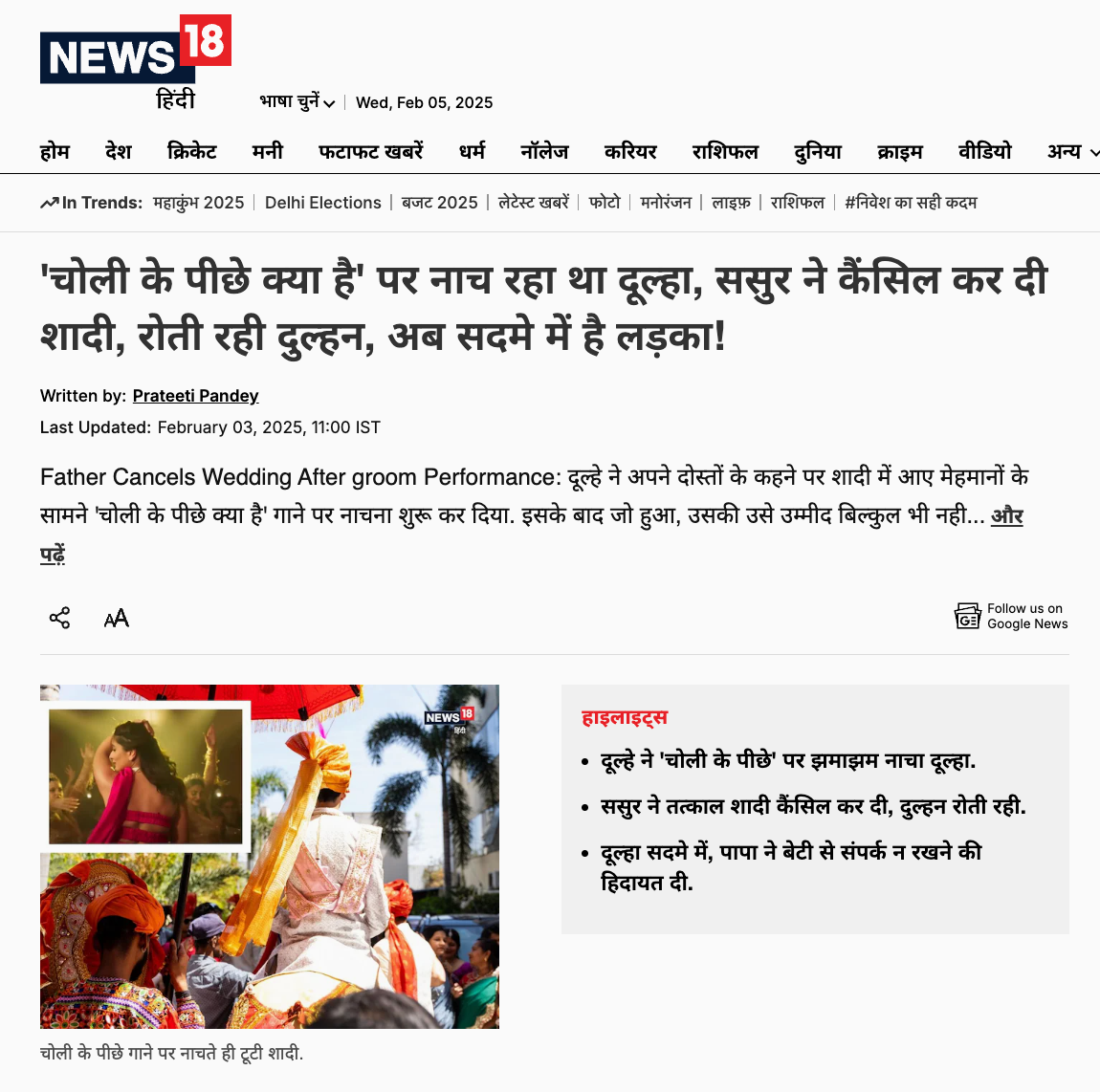 खबर की कॉपी में लिखा गया, दिल्ली में एक शादी में दूल्हे का डांस इतना महंगा पड़ गया कि उसकी शादी ही टूट गई. दूल्हा दोस्तों के कहने पर 'चोली के पीछे क्या है' गाने पर नाच रहा था, जिसे देखकर दुल्हन के पिता को गुस्सा आ गया.' खबर में यह भी बताया गया कि यह घटना 16 जनवरी की बताई जा रही है.