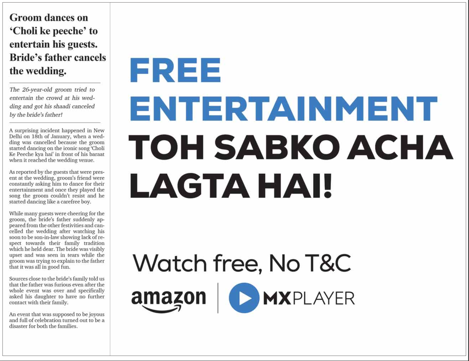 देश के कई प्रमुख न्यूज मीडिया आउटलेट ने अमेजन के ओटीटी प्लेटफॉर्म एमएक्स प्लेयर के एक विज्ञापन को खबर बनाकर पेश किया. इस खबर में मीडिया आउटलेट ने बताया कि दिल्ली में एक दूल्हे के 'चोली के पीछे क्या है' गाने पर नाचने के कारण दुल्हन के पिता ने शादी तोड़ दी.