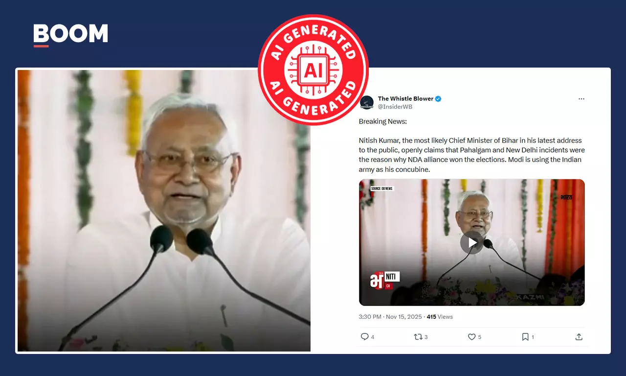 बूम ने पाया कि वायरल वीडियो एआई-जनरेटेड है और यह नीतीश कुमार के उन बयानों को गलत तरीके से पेश करता है, जो उन्होंने बिहार चुनाव से महीनों पहले दिए गए एक भाषण में किए थे.