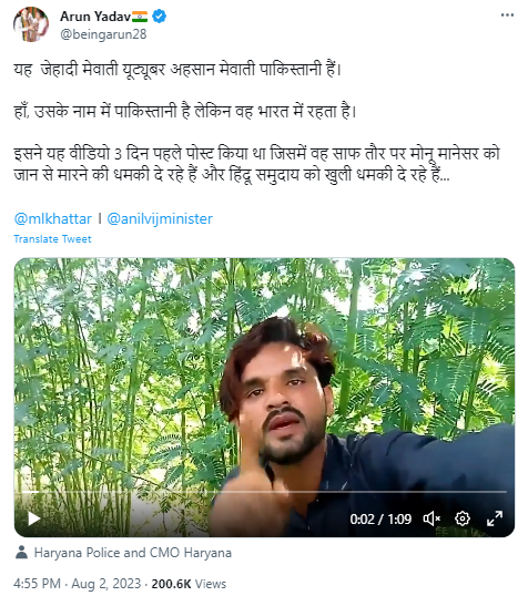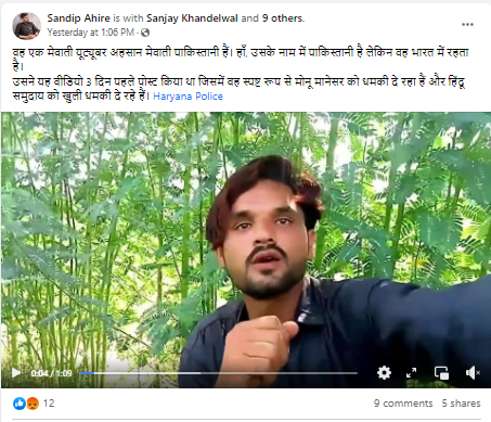 ट्विटर पर एक वेरीफ़ाइड यूज़र ने वीडियो पोस्ट करते हुए लिखा, "यह जेहादी मेवाती यूट्यूबर अहसान मेवाती पाकिस्तानी हैं। हाँ, उसके नाम में पाकिस्तानी है लेकिन वह भारत में रहता है। इसने यह वीडियो 3 दिन पहले पोस्ट किया था जिसमें वह साफ तौर पर मोनू मानेसर को जान से मारने की धमकी दे रहे हैं और हिंदू समुदाय को खुली धमकी दे रहे हैं...".