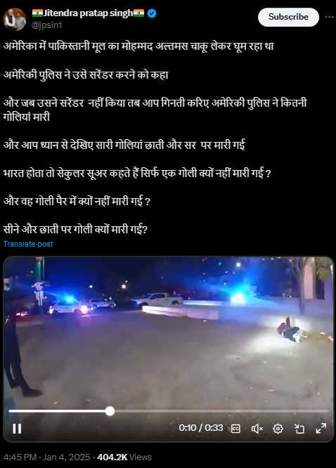अमेरिका में पुलिस की गोलीबारी का एक वीडियो सोशल मीडिया पर झूठे सांप्रदायिक दावे से वायरल है. इस दावे में कहा गया कि मोहम्मद अल्तमश नाम के पाकिस्तानी मूल के व्यक्ति को चाकू से धमकाने और सरेंडर ना करने के आरोप में अमेरिकी पुलिस द्वारा गोली मार दी गई.