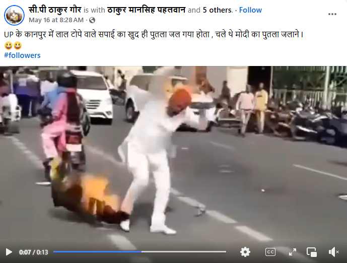 फेसबुक यूजर ने वीडियो को शेयर करते हुए लिखा है, "UP के कानपुर में लाल टोपे वाले सपाई का खुद ही पुतला जल गया होता, चले थे मोदी का पुतला जलाने."