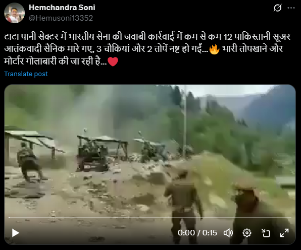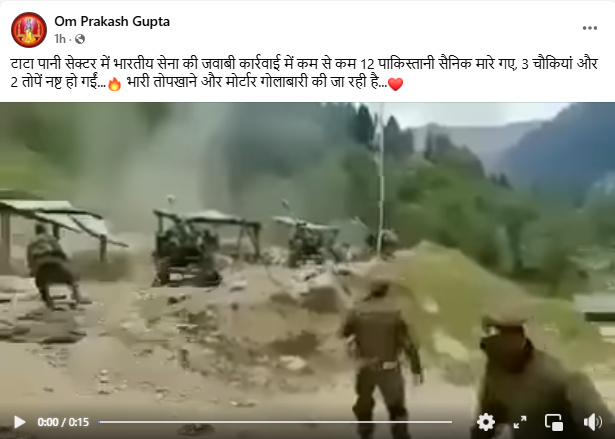 फेसबूक यूजर ने वीडियो को शेयर करते हुए लिखा है, 'टाटा पानी सेक्टर में भारतीय सेना की जवाबी कार्रवाई में कम से कम 12 पाकिस्तानी सैनिक मारे गए, 3 चौकियां और 2 तोपें नष्ट हो गईं.. भारी तोपखाने और मोर्टार से गोलाबारी की जा रही है.'