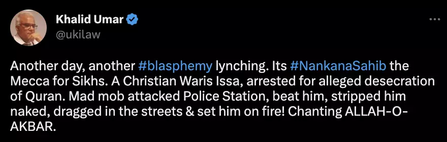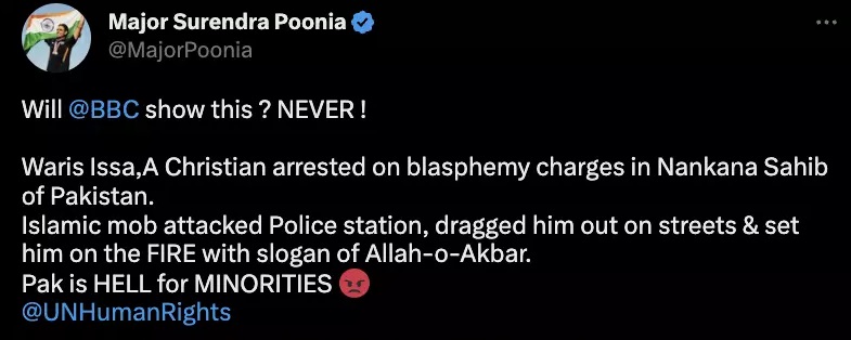 मेजर सुरेंद्र पूनिया ने वायरल दावे को भीड़ द्वारा आग लगाए जा रहे वीडियो के साथ अपने वेरिफ़ाईड ट्विटर अकाउंट से शेयर किया है. पूनिया ने अंग्रेज़ी कैप्शन के साथ वायरल दावा शेयर किया है, जिसके अनुसार “वारिस इस्सा नाम के एक ईसाई व्यक्ति को ईशनिंदा के आरोप में पाकिस्तान के ननकाना साहिब में गिरफ़्तार किया गया था. लेकिन मुस्लिम भीड़ ने पुलिस थाने पर हमला कर और उसे सड़कों पर घसीटते हुए लाकर अल्लाह हू अकबर के नारे के साथ आग लगा दिया”.