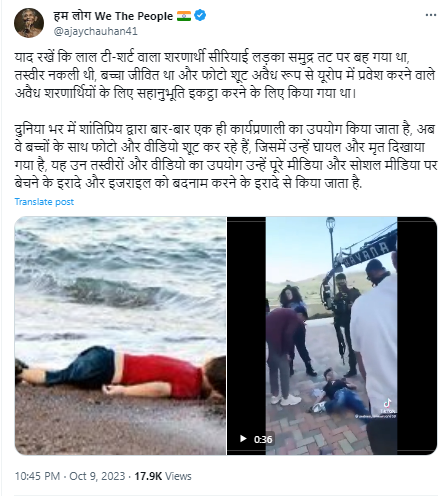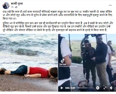 फ़ेसबुक पर एक यूज़र ने वीडियो और तस्वीर शेयर करते हुए लिखा, "याद रखें कि लाल टी-शर्ट वाला शरणार्थी सीरियाई लड़का समुद्र तट पर बह गया था, तस्वीर नकली थी, बच्चा जीवित था और फोटो शूट अवैध रूप से यूरोप में प्रवेश करने वाले अवैध शरणार्थियों के लिए सहानुभूति इकट्ठा करने के लिए किया गया था।