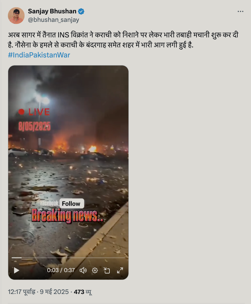 एक्स पर एक यूजर ने इस वीडियो को शेयर करते हुए लिखा, ‘अरब सागर में तैनात INS विक्रांत ने कराची को निशाने पर लेकर भारी तबाही मचानी शुरू कर दी है. नौसेना के हमले से कराची के बंदरगाह समेत शहर में भारी आग लगी हुई है.’