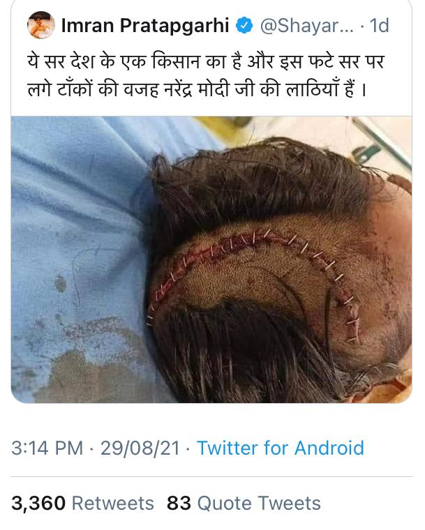 ट्विटर पर इस तस्वीर को कांग्रेस नेता और शायर इमरान प्रतापगढ़ी ने भी शेयर किया और कैप्शन दिया 'ये सर देश के एक किसान का है और इस फटे सर पर लगे टॉंकों की वजह नरेंद्र मोदी जी की लाठियॉ हैं.' हालाँकि बाद में उन्होंने ये ट्वीट डिलीट कर दिया.
