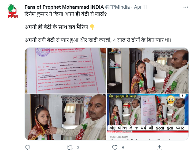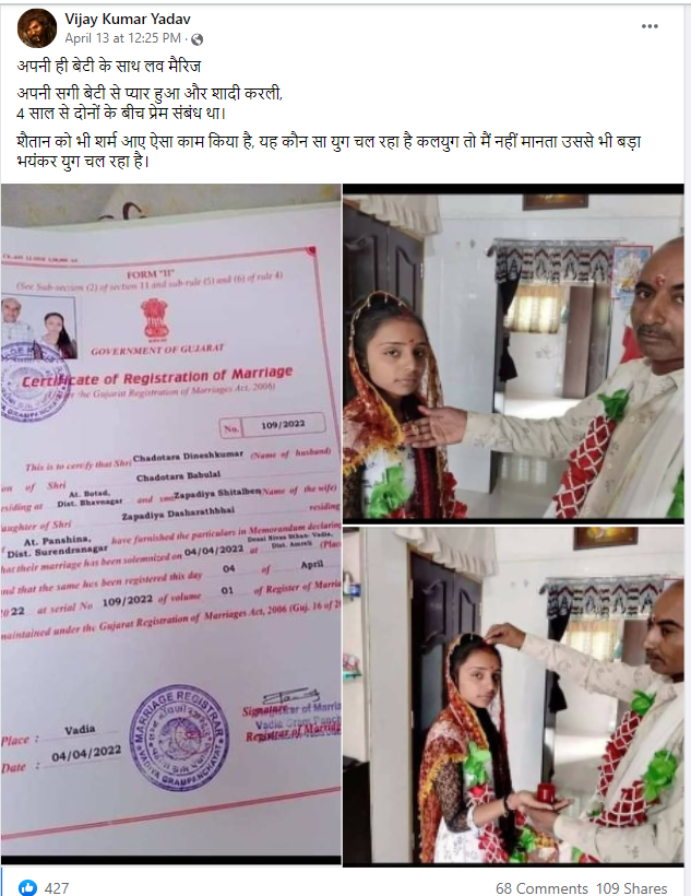 फ़ेसबुक पर एक यूज़र Vijay Kumar Yadav ने तस्वीरों को पोस्ट करते हुए लिखा है,'अपनी ही बेटी के साथ लव मैरिज,अपनी सगी बेटी से प्यार हुआ और शादी करली, 4 साल से दोनों के बीच प्रेम संबंध था। शैतान को भी शर्म आए ऐसा काम किया है, यह कौन सा युग चल रहा है कलयुग तो मैं नहीं मानता उससे भी बड़ा भयंकर युग चल रहा है।'