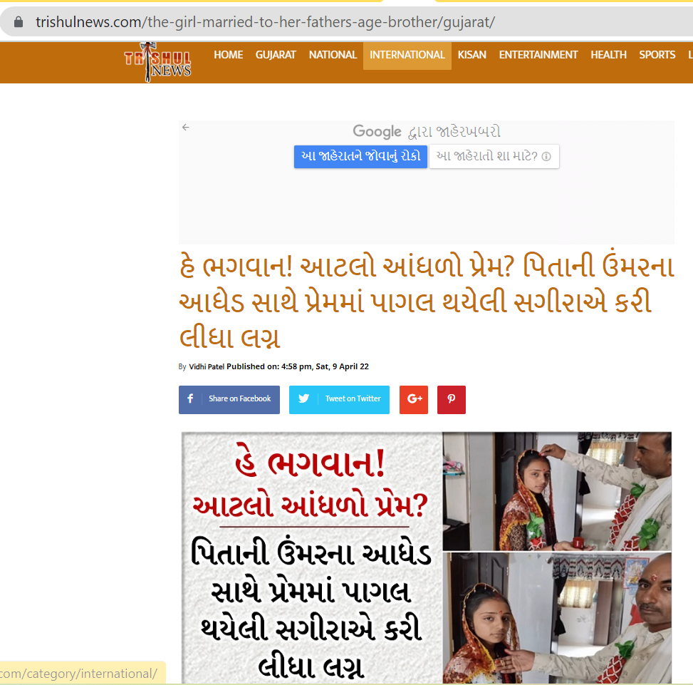 इस रिपोर्ट के अनुसार गुजरात के बोटाद जिले के रहने वाले दिनेशभाई को शीतल नाम की लड़की से प्यार हो गया और उन्होंने बिना सोचे-समझे शादी कर ली जबकि दोनों के बीच बाप-बेटी की उम्र जितना अंतर है. दिनेशभाई गुजरात के बोटाद जिले के रहने वाले और शीतल सुरेंद्रनगर की रहने वाली बताई जाती है. रिपोर्ट में कहीं भी दोनों के पिता-पुत्री होने की बात नहीं है.