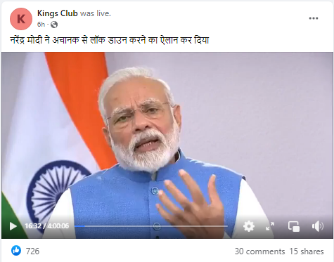 फ़ेसबुक पर एक यूज़र ने वीडियो शेयर करते हुए लिखा,'नरेंद्र मोदी ने अचानक से लॉक डाउन करने का ऐलान कर दिया'.