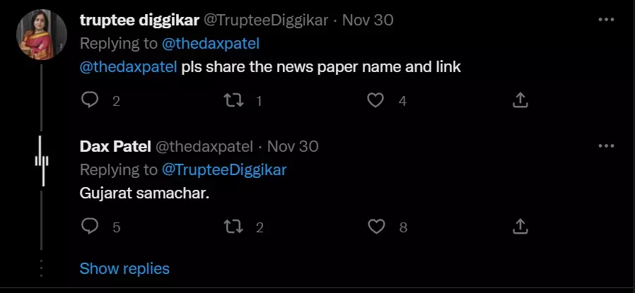 मुकुंद पांड्या ने बूम को बताया कि अख़बार कटिंग फ़र्ज़ी थी. उन्होंने कहा, "हमने कटिंग की जांच की. गुजरात समाचार के किसी भी संस्करण द्वारा ऐसा कोई लेख प्रकाशित नहीं किया गया है. किसी ने शरारत से कटिंग बनाई और फिर दावा किया कि यह हमारे अख़बार में प्रकाशित स्टोरी है. यह सच नहीं है."