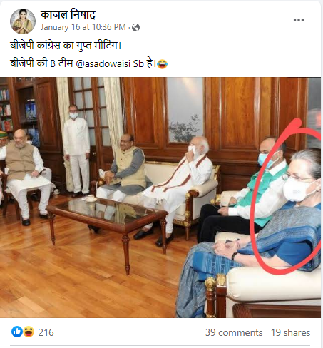फ़ेसबुक पर यूज़र से तस्वीर को शेयर करते हुए लिखा,'बीजेपी कांग्रेस का गुप्त मीटिंग. बीजेपी की B टीम @asadowaisi Sb है।'