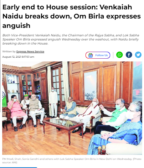 12 अगस्त 2021 की हिंदुस्तान टाइम्स रिपोर्ट में भी यह तस्वीर इस्तेमाल की गई है. तस्वीर को सदन के स्थगन के बाद लोकसभा अध्यक्ष के कक्ष में संसद की कार्यवाही को लेकर पक्ष-विपक्ष की मीटिंग की बताया हुआ है.