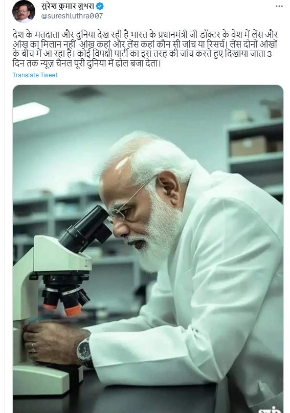 सुरेश कुमार लुथरा नाम के वेरिफ़ाईड ट्विटर हैंडल से इस तस्वीर को शेयर किया गया है. तस्वीर शेयर करते हुए कैप्शन में लिखा गया है, “देश के मतदाता और दुनिया देख रही है भारत के प्रधानमंत्री जी डॉक्टर के वेश में लेंस और आंख का मिलान नहीं आंख कहां और लेंस कहां कौन सी जांच या रिसर्च। लेंस दोनों आंखों के बीच में आ रहा है। कोई विपक्षी पार्टी का इस तरह की जांच करते हुए दिखाया जाता 3 दिन तक न्यूज़ चैनल पूरी दुनिया में ढोल बजा देता”.