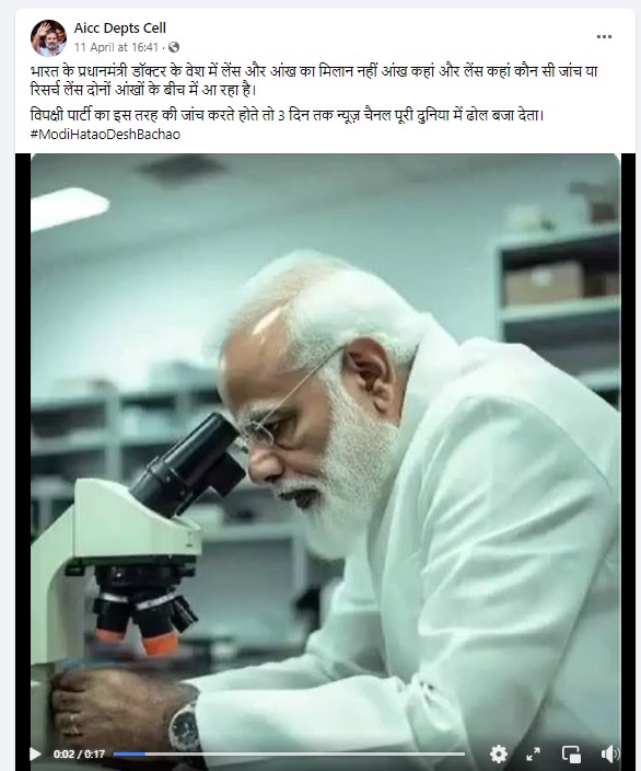 सोशल मीडिया पर प्रधानमंत्री नरेंद्र मोदी की एक तस्वीर वायरल हो रही है, जिसमें वो सफ़ेद कोट पहन कर माइक्रोस्कोप में देखते हुए नज़र आ रहे हैं. इस तस्वीर को शेयर करते हुए यूज़र्स प्रधानमंत्री मोदी पर तंज कस रहे हैं और दावा कर रहे हैं कि “उन्हें लेंस देखना भी नहीं आता है और वे दोनों आंखों के बीच लेंस लाकर जांच कर रहे हैं.”