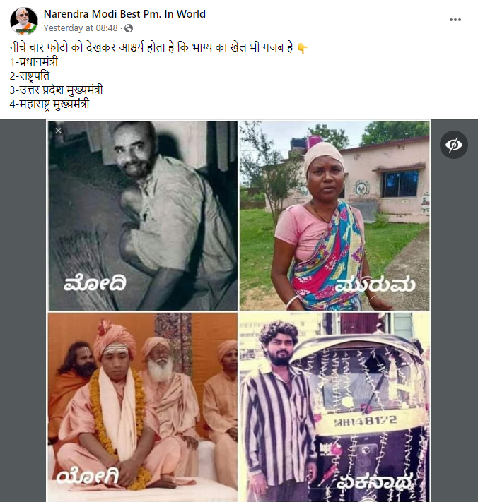 फोटोज के इस कोलाज को कई कैप्शन के साथ शेयर किया जा रहा है. एक ऐसा ही कैप्शन हिंदी में है, जिसमें लिखा हुआ है "नीचे चार फोटो को देखकर आश्चर्य होता है कि भाग्य का खेल भी गजब है 👇 1-प्रधानमंत्री 2-राष्ट्रपति 3-उत्तर प्रदेश मुख्यमंत्री 4-महाराष्ट्र मुख्यमंत्री".