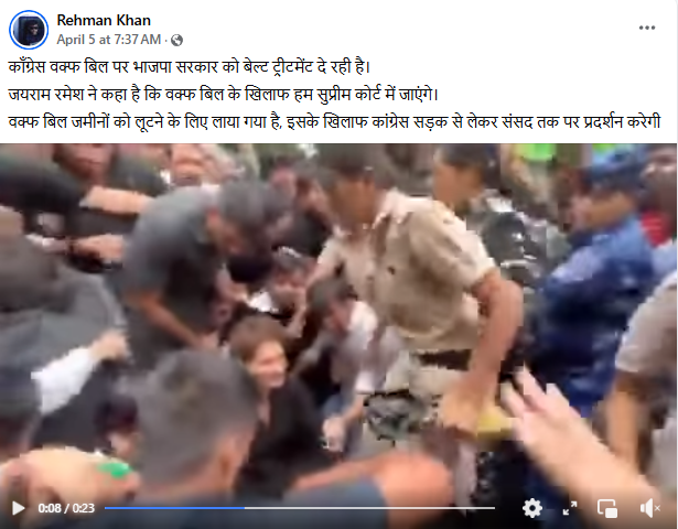 फेसबुक यूजर ने वीडियो को शेयर करते हुए लिखा है, 'कांग्रेस वक्फ बिल पर भाजपा सरकार को बेल्ट ट्रीटमेंट दे रही है...'