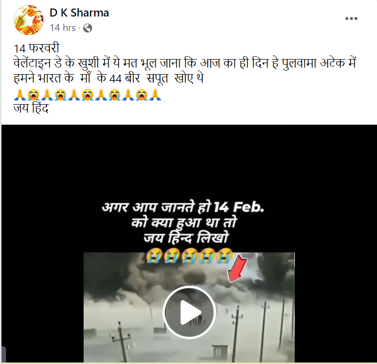 फ़ेसबुक पर एक यूज़र DK Sharma ने वीडियो शेयर करते हुए कैप्शन लिखा है '14 फरवरी वेलेंटाइन डे के खुशी में ये मत भूल जाना कि आज का ही दिन हे पुलवामा अटेक में हमने भारत के माँ के 44 बीर सपूत खोए थे जय हिंद'.
