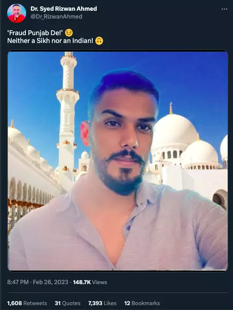 टीवी पैनलिस्ट डॉ सैयद रिजवान अहमद ने अपने ट्विटर अकाउंट से अंग्रेज़ी कैप्शन के साथ इस तस्वीर को शेयर किया है, जिसका हिंदी अनुवाद है “पंजाब का धोखेबाज, न तो सिख और न ही भारतीय”.