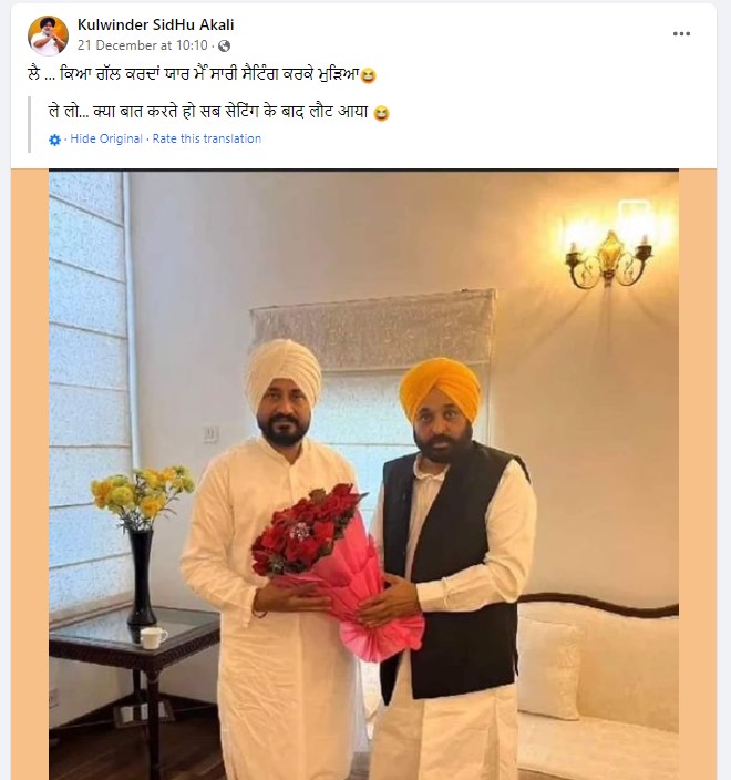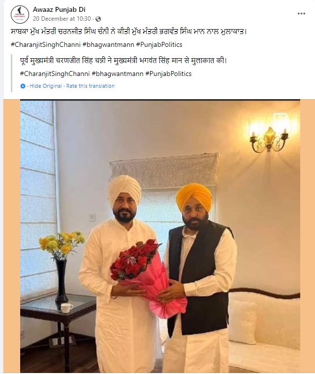 वायरल तस्वीर को फ़ेसबुक पर पंजाबी कैप्शन के साथ साझा किया जा रहा है, जिसका हिंदी अनुवाद है "पूर्व मुख्यमंत्री चरणजीत सिंह चन्नी ने मुख्यमंत्री भगवंत सिंह मान से मुलाकात की".
