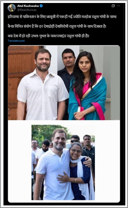 एक्स पर इन तस्वीरों को शेयर करते हुए एक दक्षिणपंथी यूजर ने लिखा, 'हरियाणा से पाकिस्तान के लिए जासूसी में पकड़ी गई ज्योति मल्होत्रा राहुल गांधी के साथ! कैसा विचित्र संयोग है कि हर देशद्रोही देशविरोधी राहुल गांधी के साथ दिखता है! क्या देश में हो रही उथल-पुथल के मास्टरमाइंड राहुल गांधी ही हैं!!'