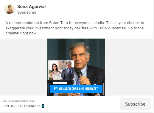 फ़ेसबुक पर एड/ स्पॉन्सर्ड पोस्ट के रूप में सोना अग्रवाल नाम के यूज़र ने वीडियो को शेयर करते हुए लिखा, "भारत में सभी के लिए रतन टाटा की एक सिफारिश। 100% गारंटी के साथ जोखिम मुक्त होकर आज ही अपने निवेश को बढ़ाने का आपके पास मौका है। अभी चैनल पर जाएं."