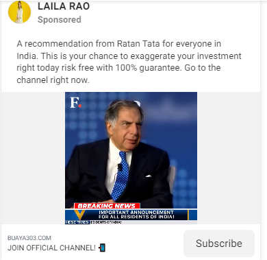 समान कैप्शन के साथ दूसरी वीडियो भी एड/ स्पॉन्सर्ड पोस्ट के रूप में लैला राव नामक यूज़र ने शेयर किया है. इस वीडियो में रतन टाटा कहते हैं कि "ध्यान दें: मैं भारत के सभी निवासियों के लिए एक नए इन्वेस्टमेंट प्रोजेक्ट की शुरुआत की घोषणा करता हूं. मैं व्यक्तिगत रूप से इस प्रोजेक्ट का समर्थन करता हूं जो गारंटी देता है कि भारत का कोई भी निवासी बिना किसी जोखिम के अपना पैसा बढ़ा सकता है. मैं लैला राव को इस प्रोजेक्ट का हेड नियुक्त करता हूं.."