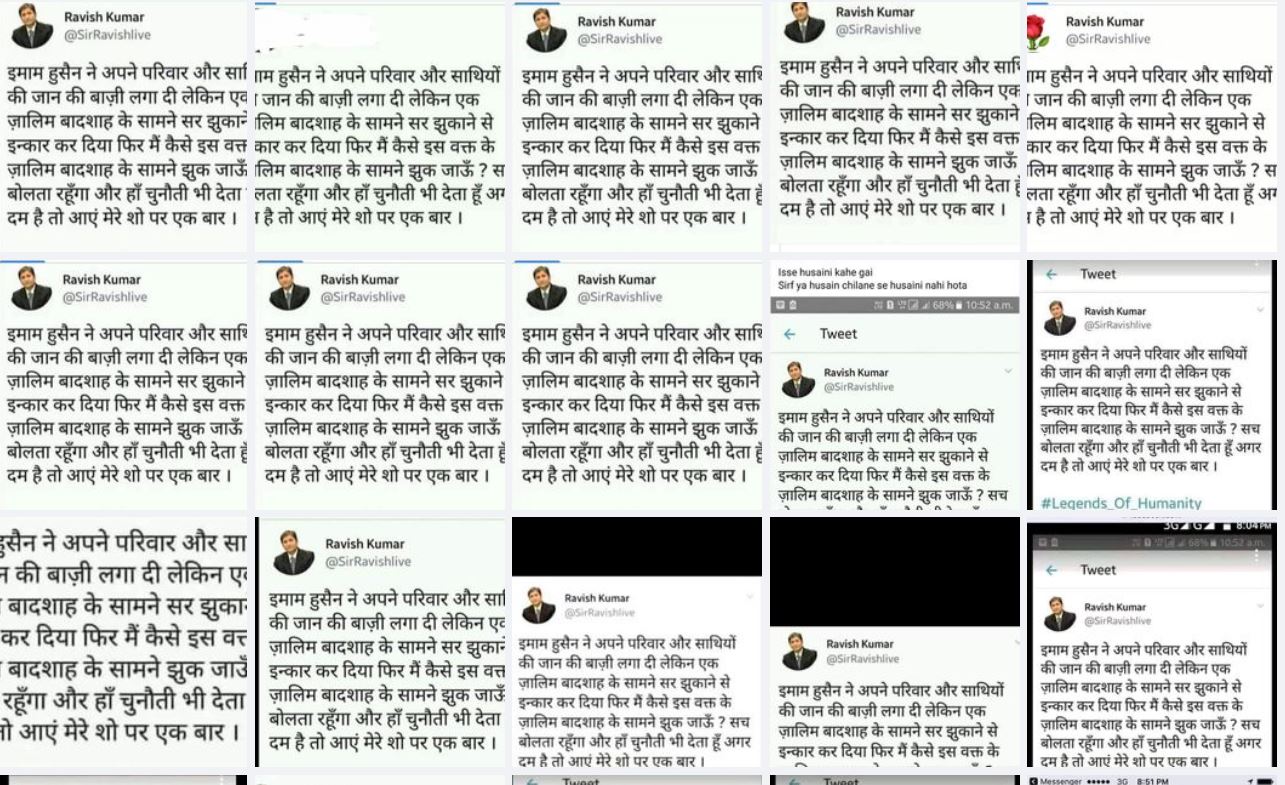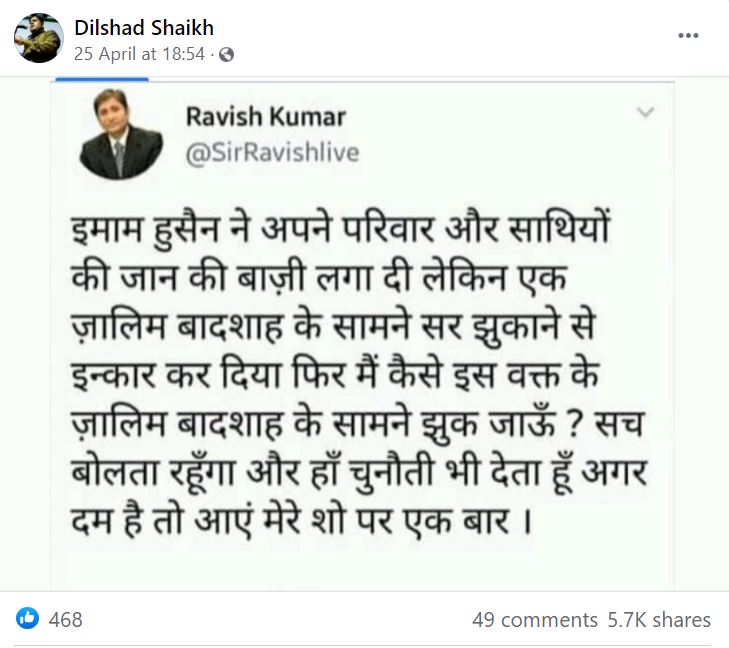 एन.डी.टी.वी. (NDTV) के वरिष्ठ पत्रकार रवीश कुमार (Ravish Kumar) के नाम से एक फ़र्ज़ी हैंडल का ट्वीट वायरल हो रहा है. इसमें इमाम हुसैन और उनके परिवार का हवाला देते हुए रवीश कुमार के नाम पर ट्वीट किया गया है.